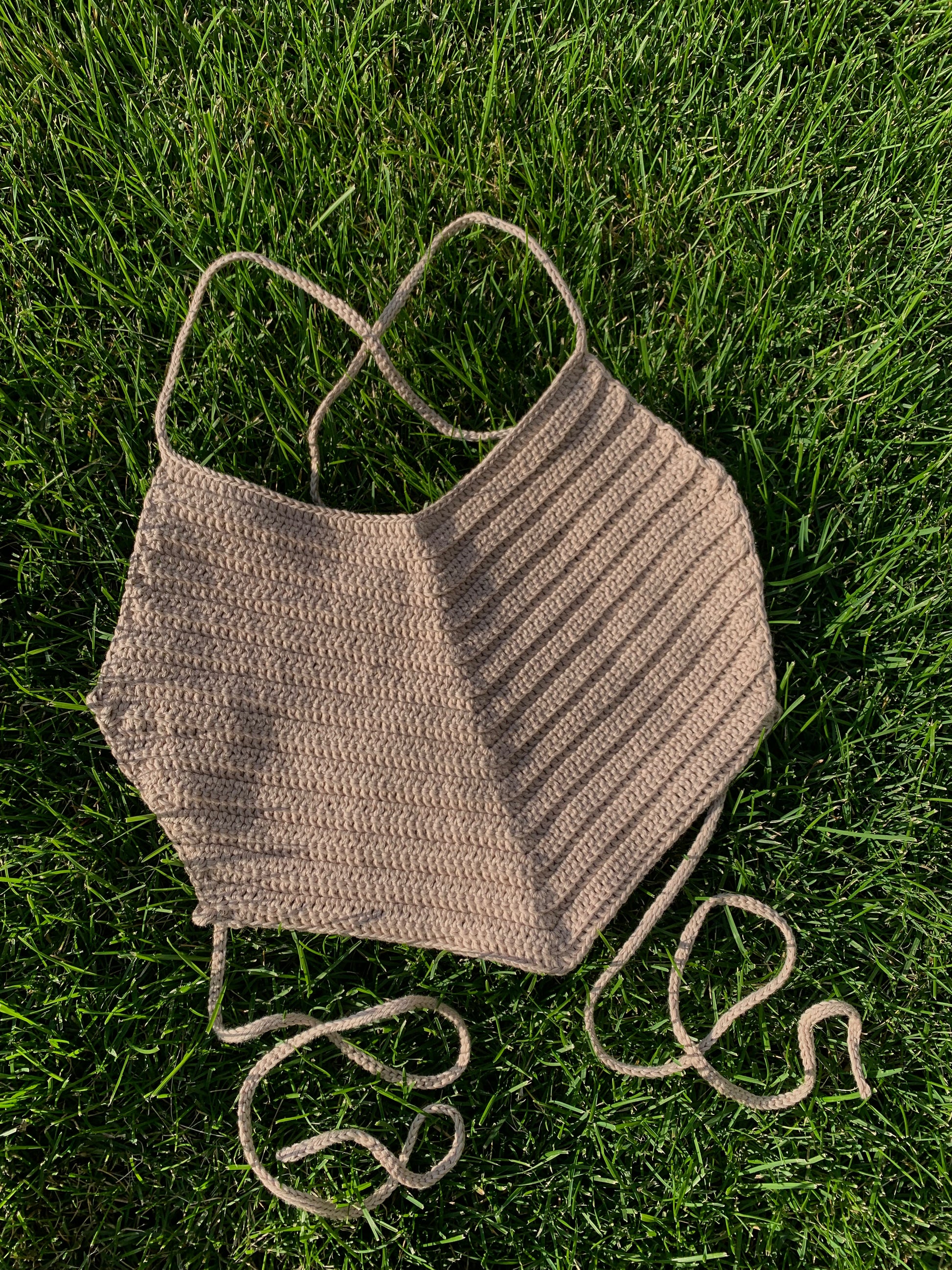 This lightweight, backless crochet top is featuring a flattering V-neckline, a ribbed texture, and a V shape at the hem. The cross-tie back makes the top fully adjustable, so it can comfortably fit sizes S–M depending on your desired fit. Whether you're wearing it loosely or more fitted, the ties allow for flexibility in how it sits on your body.